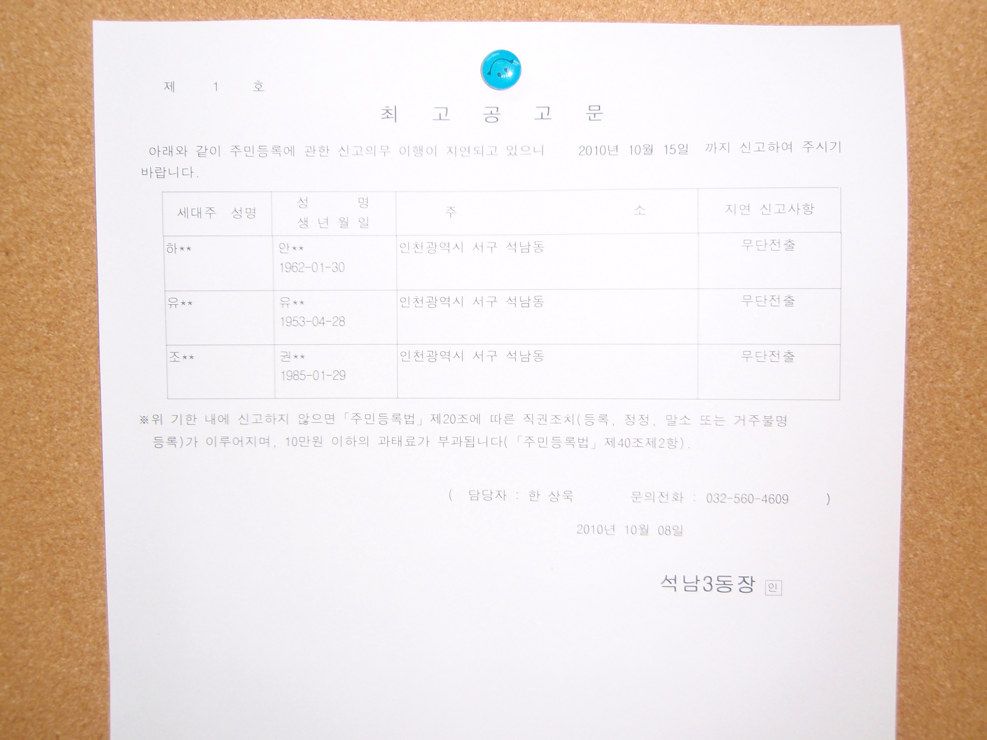 주민등록 무단전출자로 판단되는 자에 대하여 최고장을 발송하였으나 기한내에 신고하지 않아 주민등록법 제20조 및 제4항, 동법 시행령 제25조에 의거하여 아래와 같이 공고합니다.