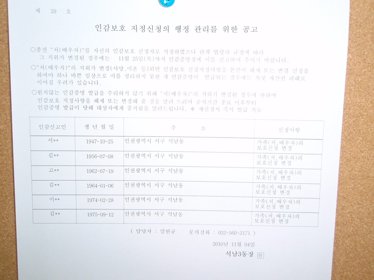 인감증명 발급 신청 시 "처(배우자)"를 인감보호자로 지정하였으나 관계변경(사망, 이혼)이후 미처 이를 신고하지 않은 상태에서 전처의 신청으로 인한 대리발급 등을 사전에 예방하고자 인감보호신청 특별신청기간동안 이를 정비하고자 합니다.