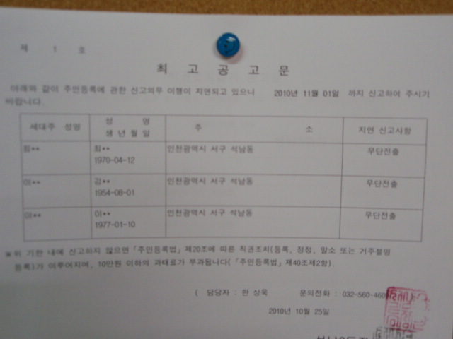 주민등록 무단전출자로 판단되는 자에 대하여 최고장을 발송하였으나 기한내에 신고하지 않아 주민등록법 제20조 및 제 4항, 동법 시행령 제25조에 의거 하여 아래와 같이 공고합니다.