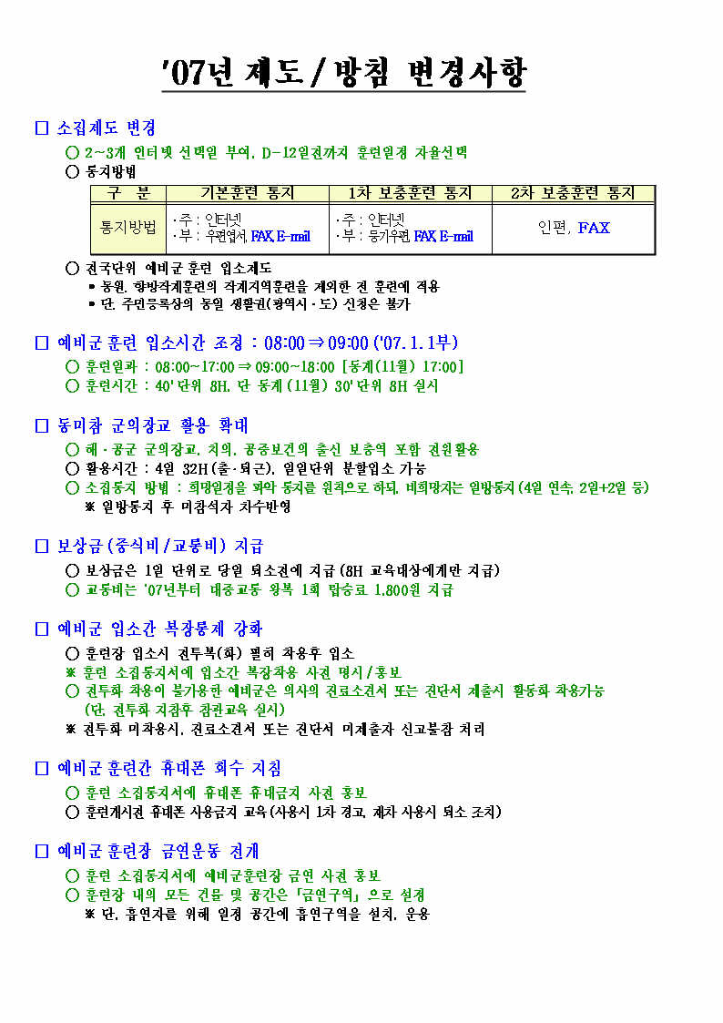 2007년 예비군 제도/방침 변경사항 안내