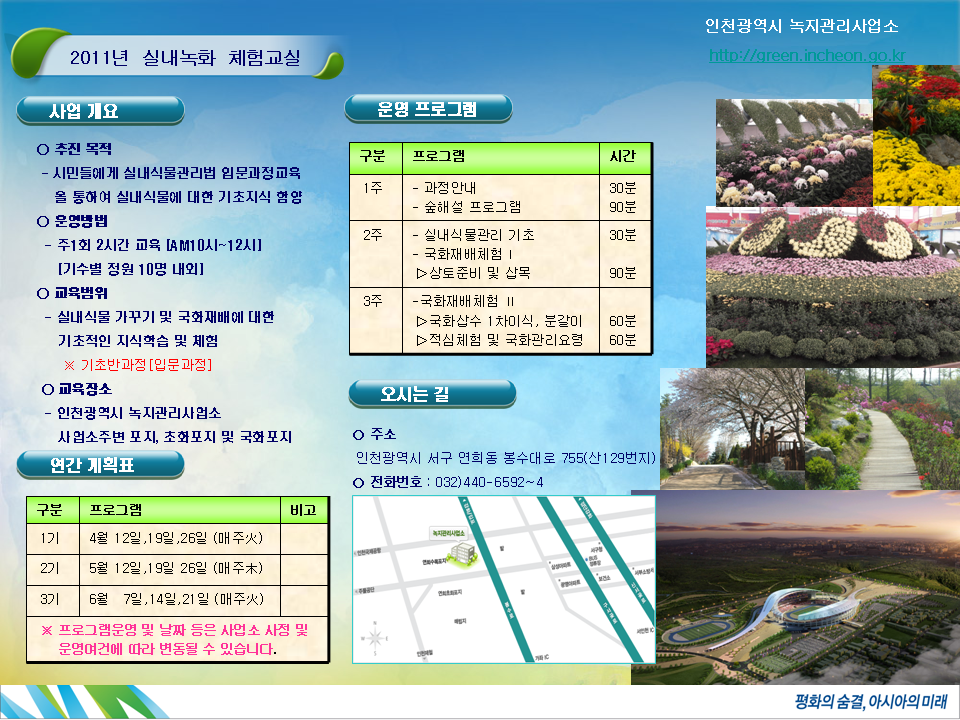 인천광역시 녹지관리사업소에서 시민을 대상으로 시범적으로 운영하는 체험프로그램인 『2011년 실내녹화 체험교실』을 아래와 같이 운영되오니 관심있는 주민들의 많은 참여를 바랍니다.