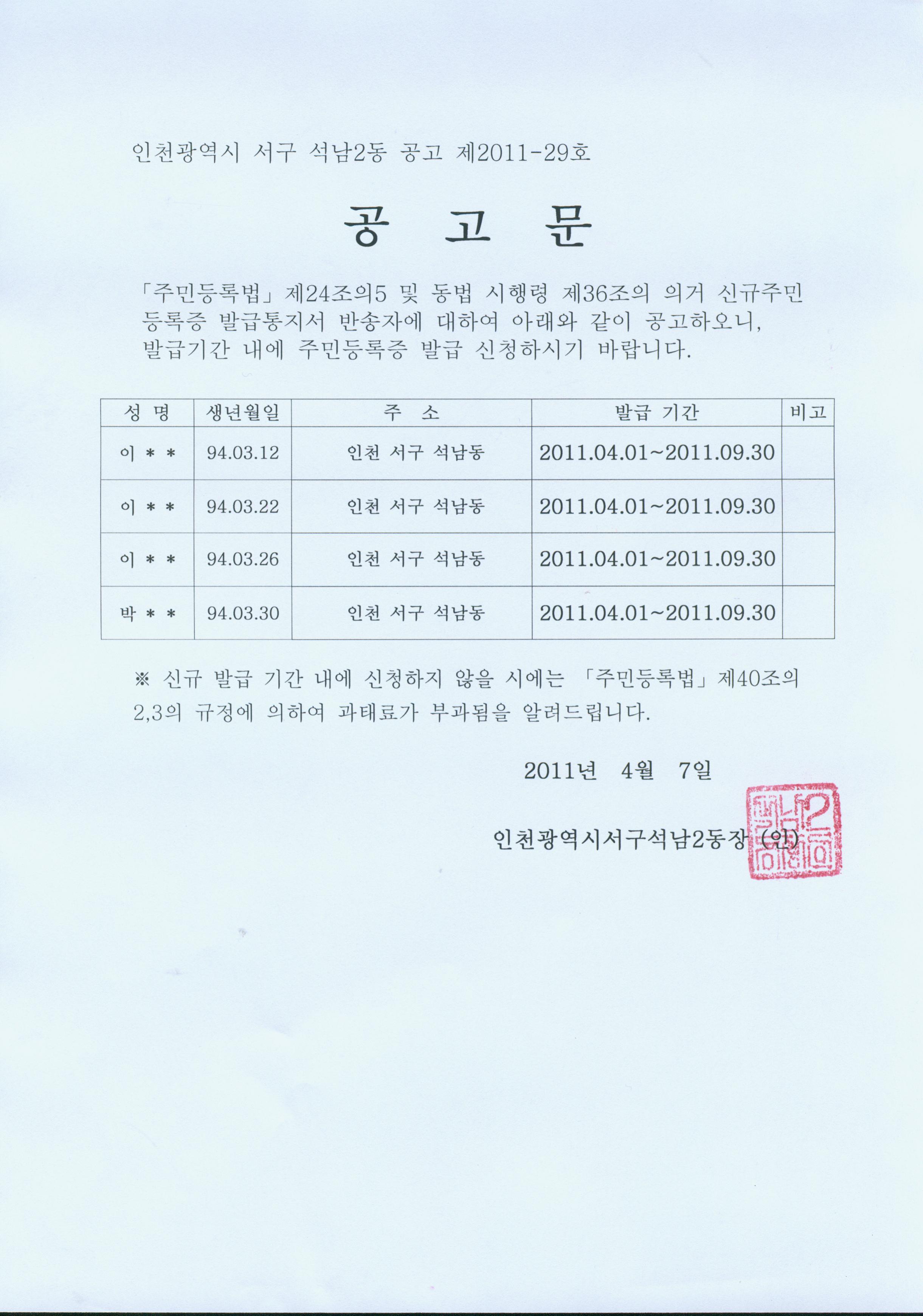 주민등록법 제24조의 5 및 동법시행령 제36조에 의거, 신규주민등록증 발급통지서 반송자에 대하여 붙임과 같이 공고하고자 합니다.