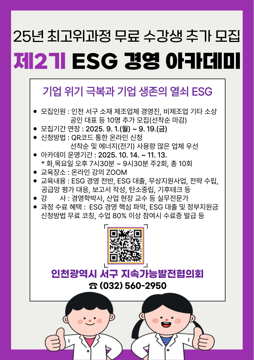 인천광역시 서구 지속가능발전협의회에서 기업 성장과 생존의 필수 요소인 ESG 경영 핵심 내용을 안내하는「제2기 ESG 경영 아카데미」수강생을 추가 모집합니다.