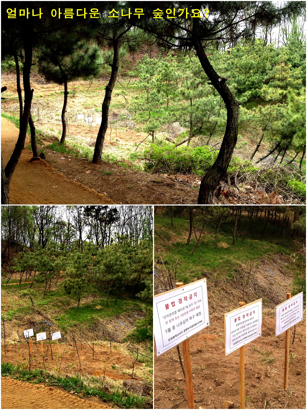 민원을 제기하였더니 이 또한 신속하게 주변에 경작하지 말라는 경고문을 설치했고 한 주가 지난 어제 확인하니 구청에서 나무를 심어 놓았습니다.