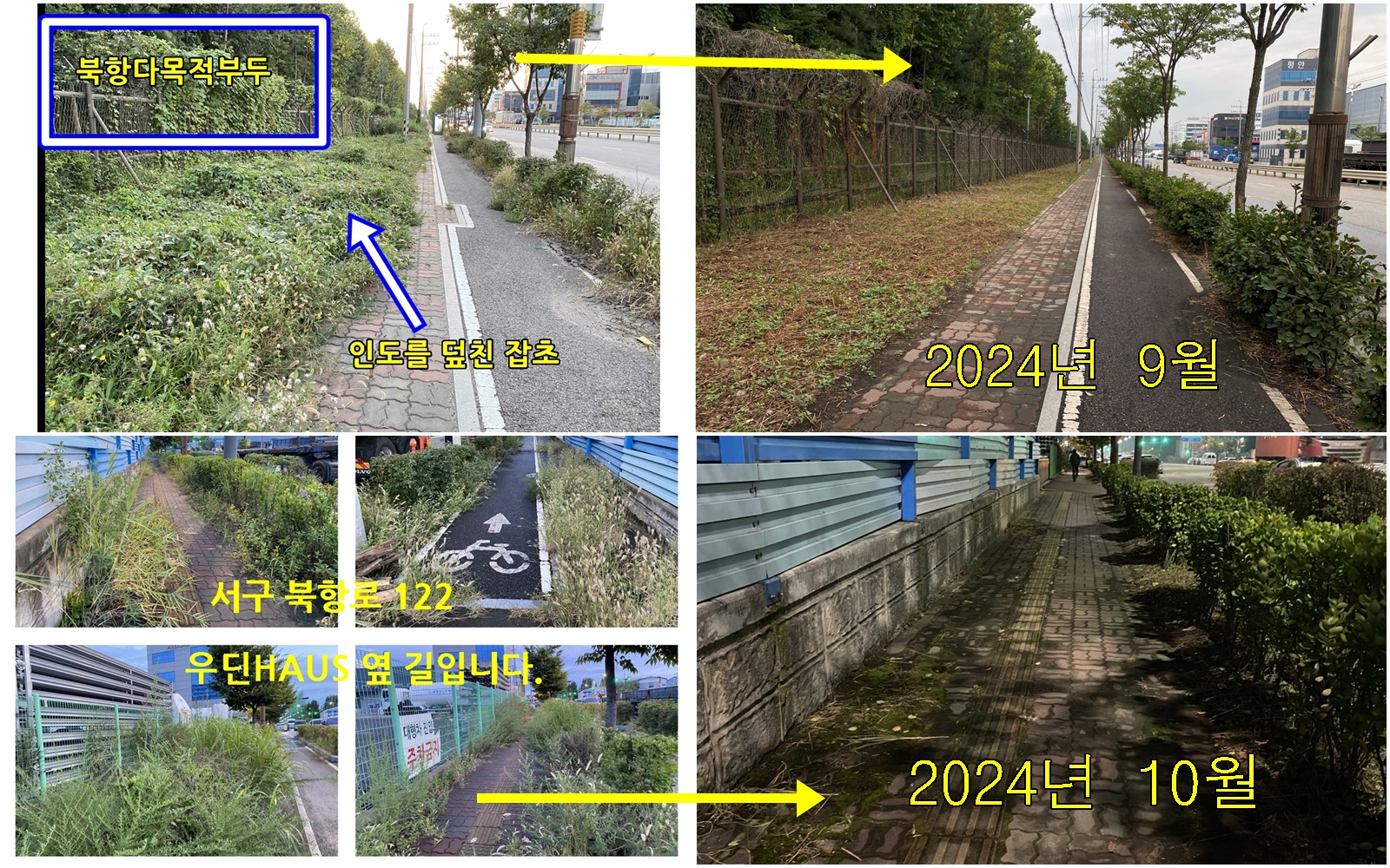 도로변에 자라는 잡초는 미관 즉 경관에도 좋지 않을뿐더러 보행자에게도 불편이 가중되는 것입니다.