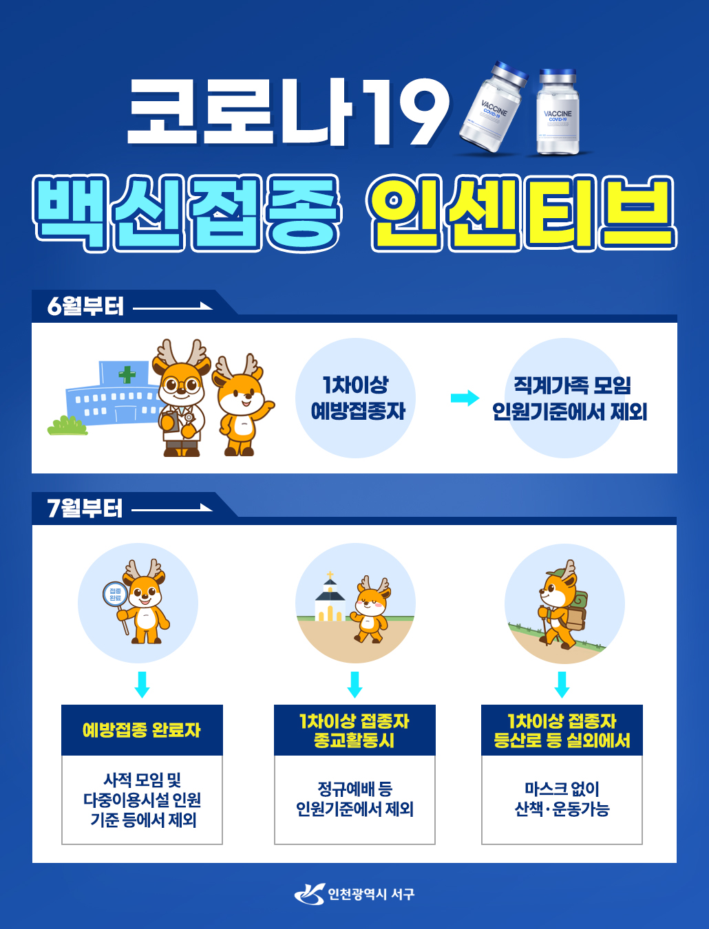 인천 서구(구청장 이재현)가 코로나19 백신 접종자의 일상 회복 지원 방안 ‘인센티브’를 홍보에 나서면서 이달부터 경로당 운영도 재개할 예정이라고 9일 밝혔다.