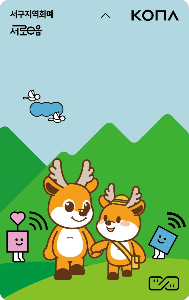 에코카드엔 서로e음 시즌3 사업인 ‘환경 마일리지’와 서구의 미래도시 비전인 ‘스마트에코시티 서구’의 정책 방향을 고려해 스마트에코시티 BI를 디자인에 녹여냈다. 더불어 서동이와 동동이가 함께 손잡은 모습을 통해 서로를 이어주는 ‘이음 철학’을 담아냈고, 친근감까지 더했다.