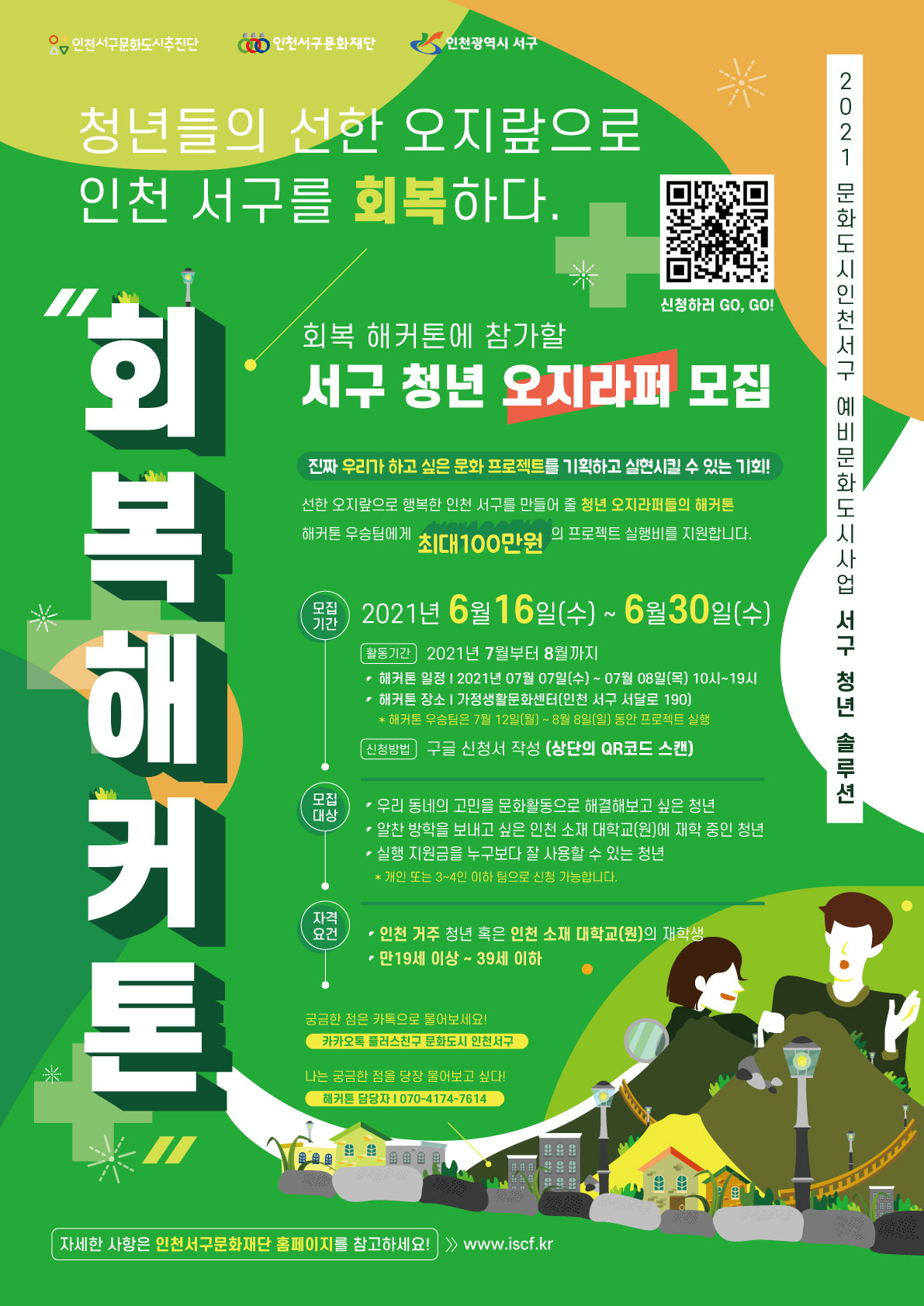 인천서구문화도시추진단은 ‘서구청년 솔루션-회복해커톤’에 참여할 청년을 오는 6월 30일까지 모집한다고 17일 밝혔다.