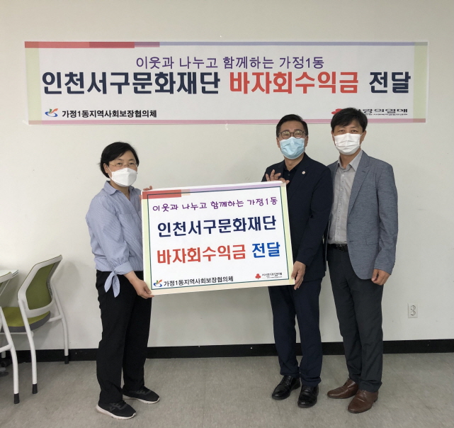 인천서구문화재단은 23일 사회공헌활동 ‘나눔, 묻고 따블로’ 행사를 통해 조성된 바자회 수익금을 가정1동 지역사회보장협의체(동장 강선숙, 공동위원장 정광숙)에 전달했다.