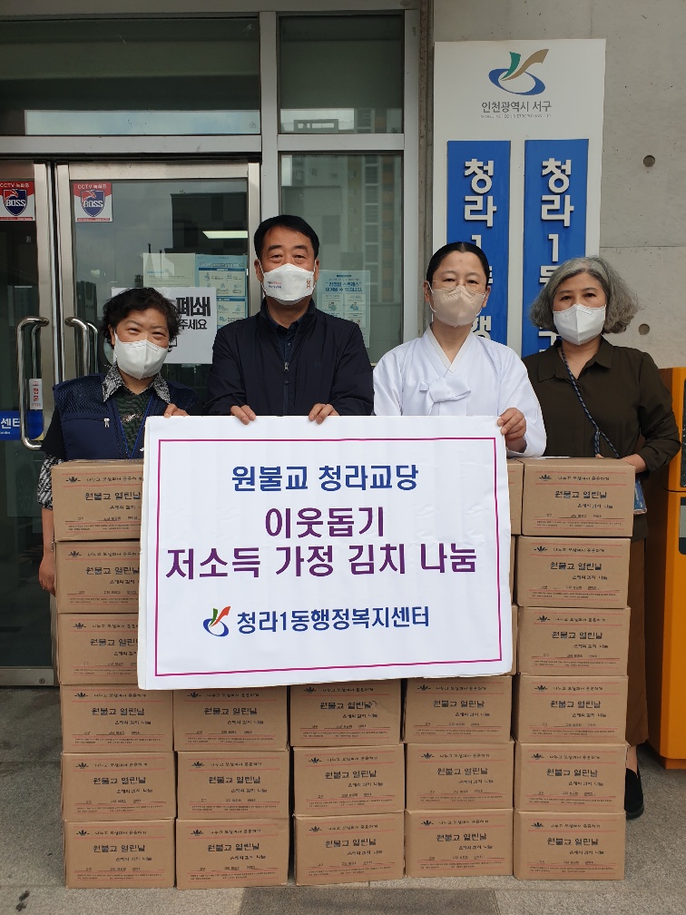 원불교 청라교당은 원불교가 열린 날, 대각개교절을 맞아 이웃사랑과 나눔을 실천하기 위해 김치를 전달하게 됐다고 설명했다. 청라교당은 매년 진행하는 김치 나눔 행사 외에도 지난해 마스크 3천 장을 청라1동에 기부하기도 했다.