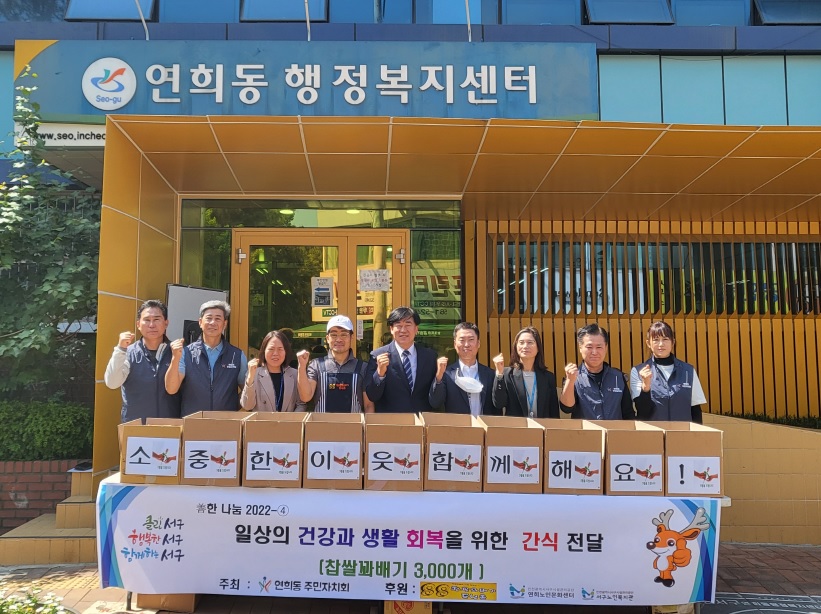 인천 서구 연희동 행정복지센터(동장 김상이)는 지난 11일 연희동 88찹쌀꽈배기도너츠(대표 조복호)와 함께 연희노인문화센터, 서구노인복지관 등 노인복지시설 급식 재개에 맞춰 꽈배기 3천개를 전달했다고 밝혔다.