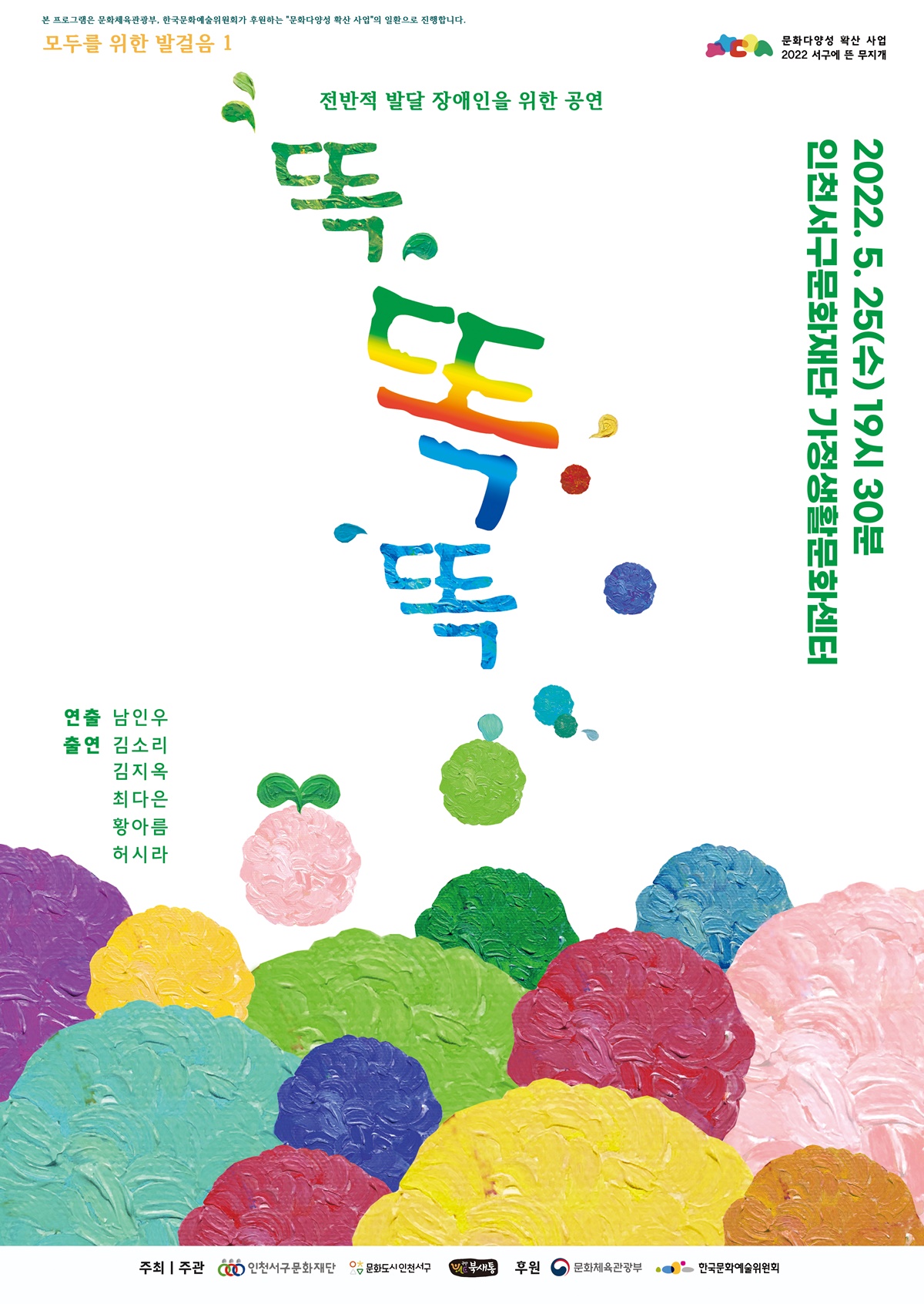 네 번째 프로그램은 발달장애아동 가정을 대상으로 한 관객참여형 연극 <똑.똑.똑>이 진행된다. 오는 5월 25일(수) 17시 30분, 가정생활문화센터에서 극단 북새통이 전반적 발달장애인을 위한 공연 창작 시리즈 ‘똑.똑.똑’을 재연한다. 낯선 공간에서 낯선 자극도 재미있게, 잠깐이라도 편안하게 누구나 즐길 수 있는 이번 공연은 사전 신청으로 운영된다.