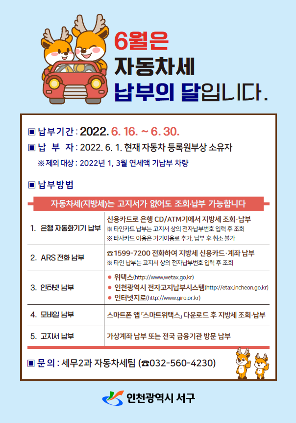 6월은 제1기분 자동차세 납부의 달이다. 인천 서구(구청장 이재현)는 2022년 6월 제1기분 자동차세 17만 2,896건, 총 193억 9,900만 원을 부과하고 납부 방법 안내에 적극 나섰다.