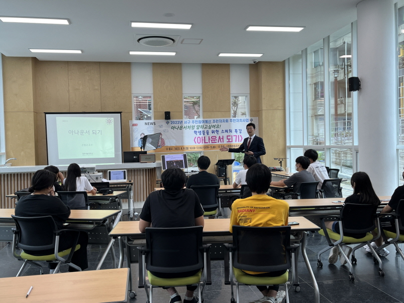 인천 서구 신현원창동 주민자치회(회장 이재석)가 8일 회화마을 커뮤니티센터에서 학생들을 대상으로 스피치 특강 ‘아나운서 되기’를 진행했다고 밝혔다.