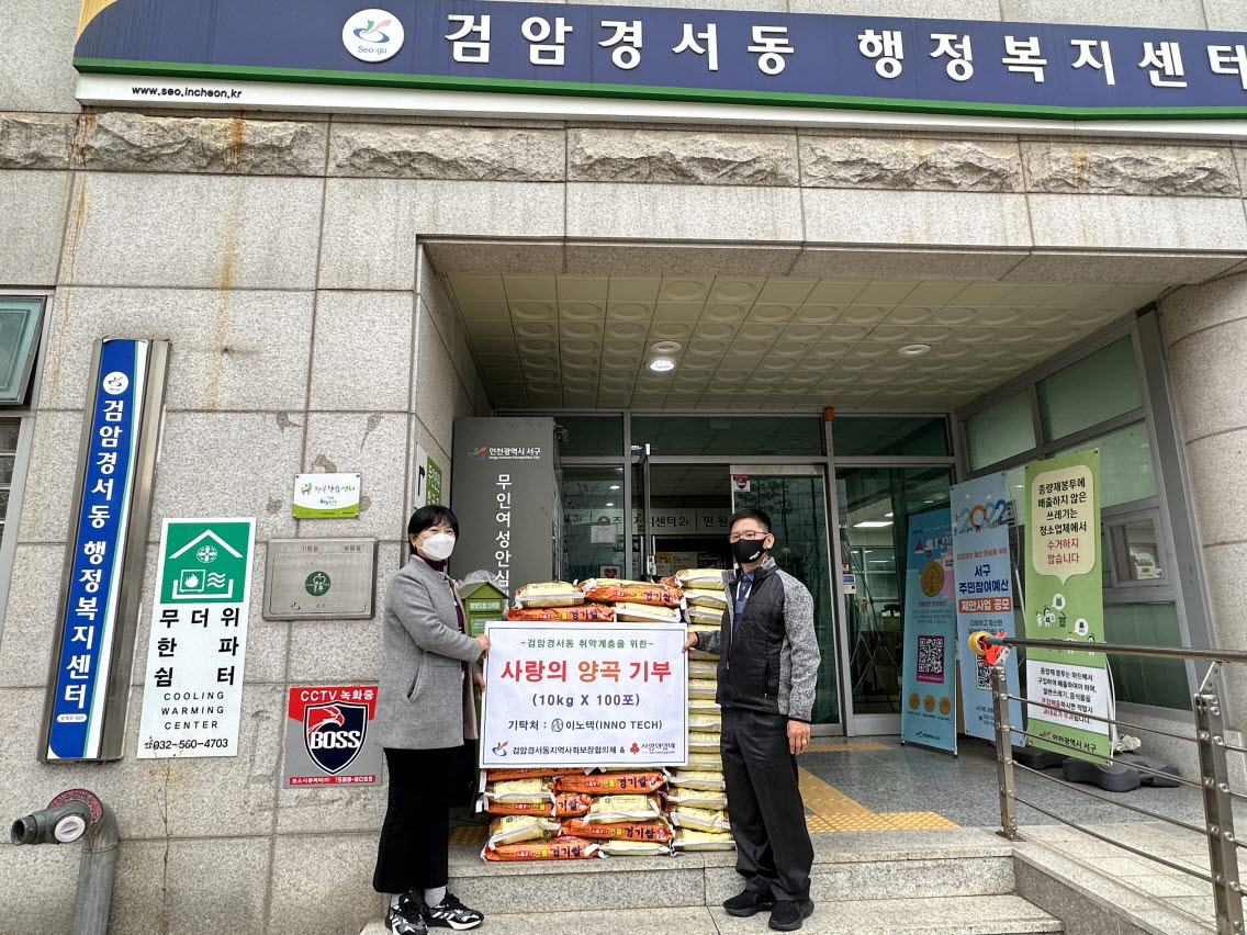 인천서부산업단지 입주기업인 이노텍(대표 강태선)은 지난 21일 검암경서동 행정복지센터(동장 이미숙)에 10kg 쌀 100포를 전달했다고 밝혔다.