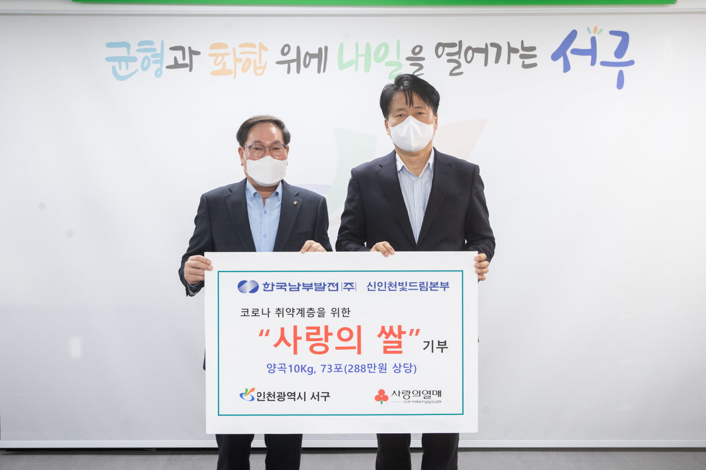 인천 서구(구청장 강범석)는 지난달 30일 한국남부발전 신인천빛드림본부(본부장 송기인)가 ‘사랑의 쌀’ 10kg 73포를 전달했다고 밝혔다.