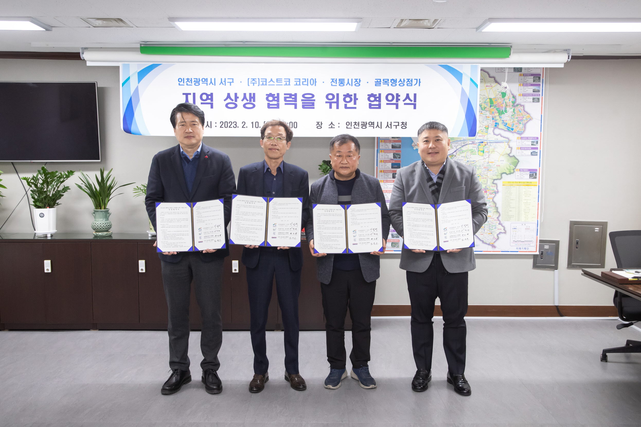 이날 협약식에는 강범석 서구청장과 가좌시장 이찬관 상인회장, 골목형상점가 연합회 곽도생 회장, ㈜코스트코 코리아 조민수 사장이 참석해 협약서에 서명했다.