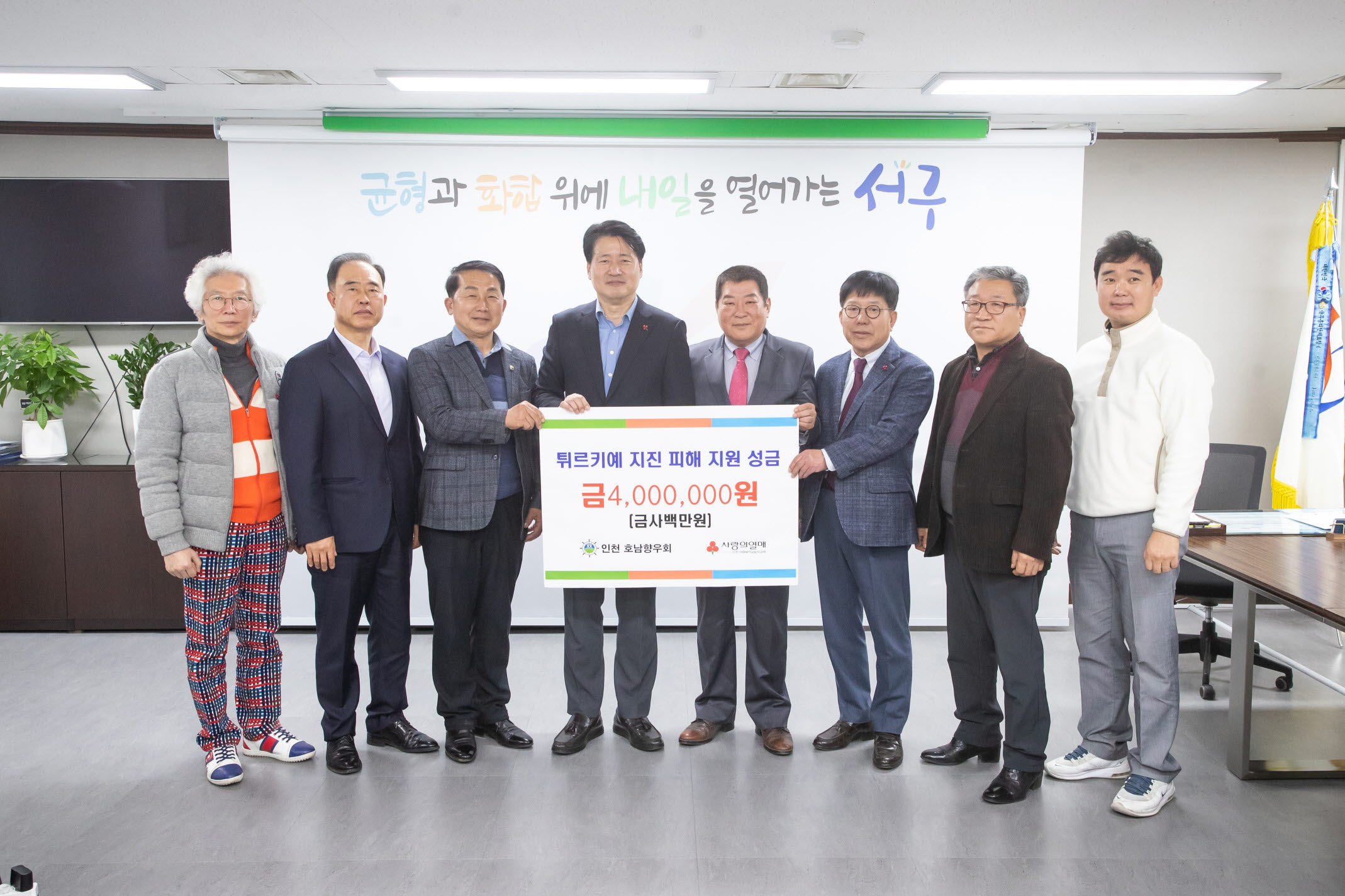 인천 서구(구청장 강범석)는 인천호남향우회(회장 정문익)가 튀르키예·시리아 지역 이재민을 위한 성금 400만 원을 인천사회복지공동모금회에 기탁했다고 7일 밝혔다.