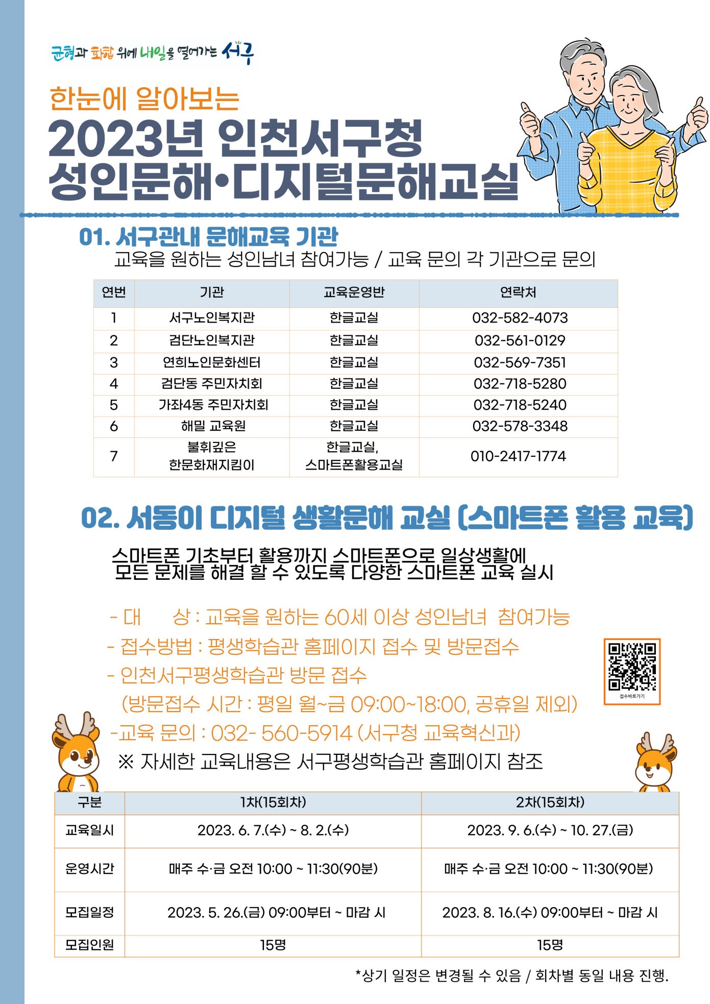 서구는 국비를 포함해 총 4천260만 원을 투입해 서구 내 성인 문해교육 프로그램을 운영하는 주민센터, 노인복지관 등을 지원한다. 한글, 수학 등 기초학력 향상과 함께 스마트폰 활용 교육이 운영되며 60세 이상 성인남녀는 누구나 가까운 곳에서 학습을 받을 수 있다.