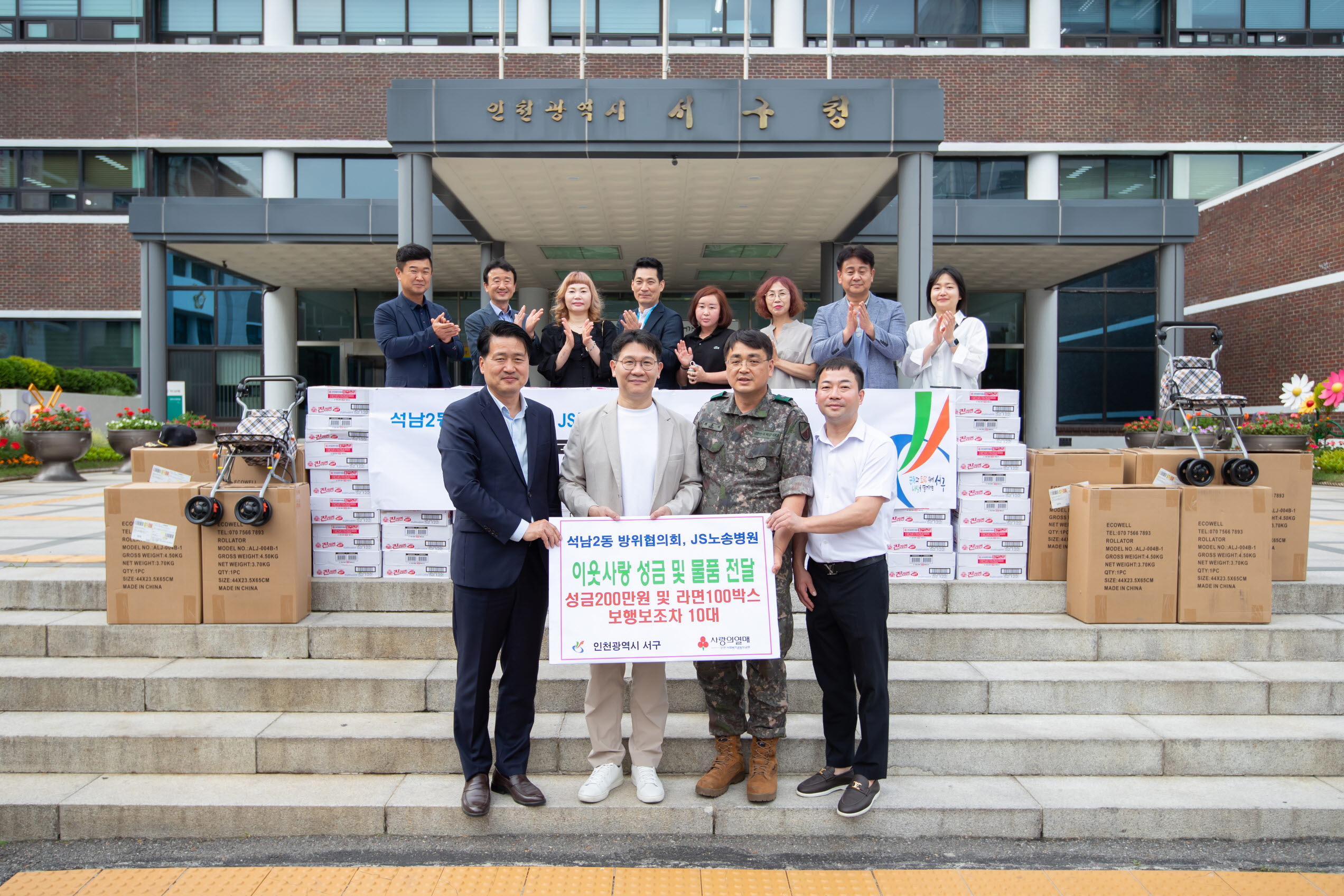인천 서구(구청장 강범석)는 7일 석남2동 방위협의회(회장 김일태)와 JS노송병원(병원장 노정호)가 함께 이웃돕기 성금 200만 원, 라면 100박스, 보행보조차 10대 등을 전달했다고 8일 밝혔다.