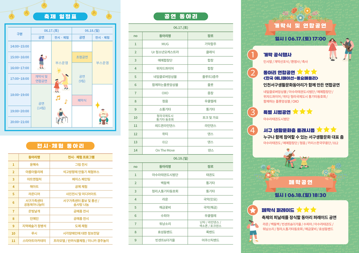 또한 이번 축제에서는 생활문화동아리 40개 팀이 공연과 전시, 체험 프로그램 등을 만들어 간다. 특히, 개막공연으로 동아리들이 함께 만드는 합동공연과 누구나 함께 참여할 수 있는 서구생활문화 대표 춤 플래시몹, 축제의 피날레를 장식할 동아리 퍼레이드 공연 등 다채로운 콘텐츠를 선보일 예정이다.