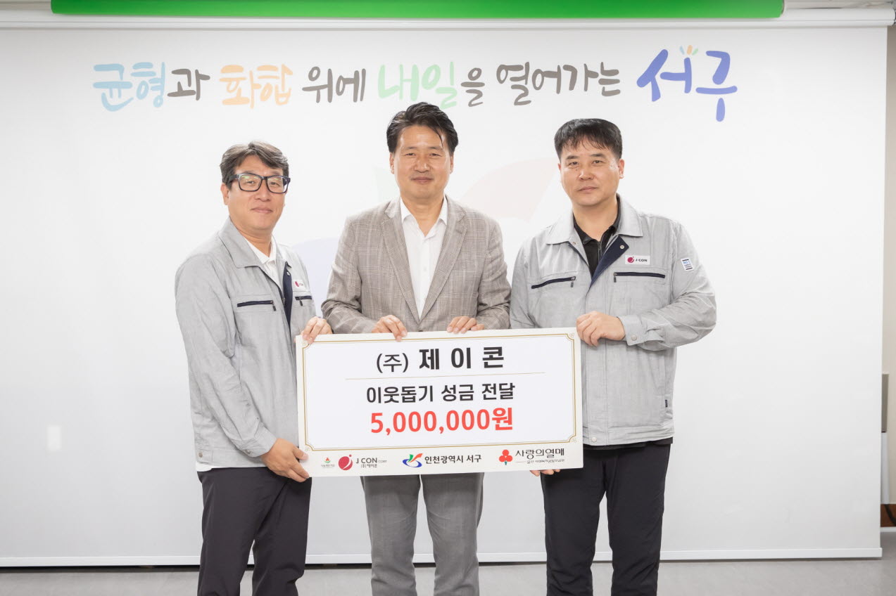 인천 서구(구청장 강범석)는 20일 ㈜제이콘(대표이사 홍대성)이 이웃돕기 성금 500만 원을 전달했다고 밝혔다.