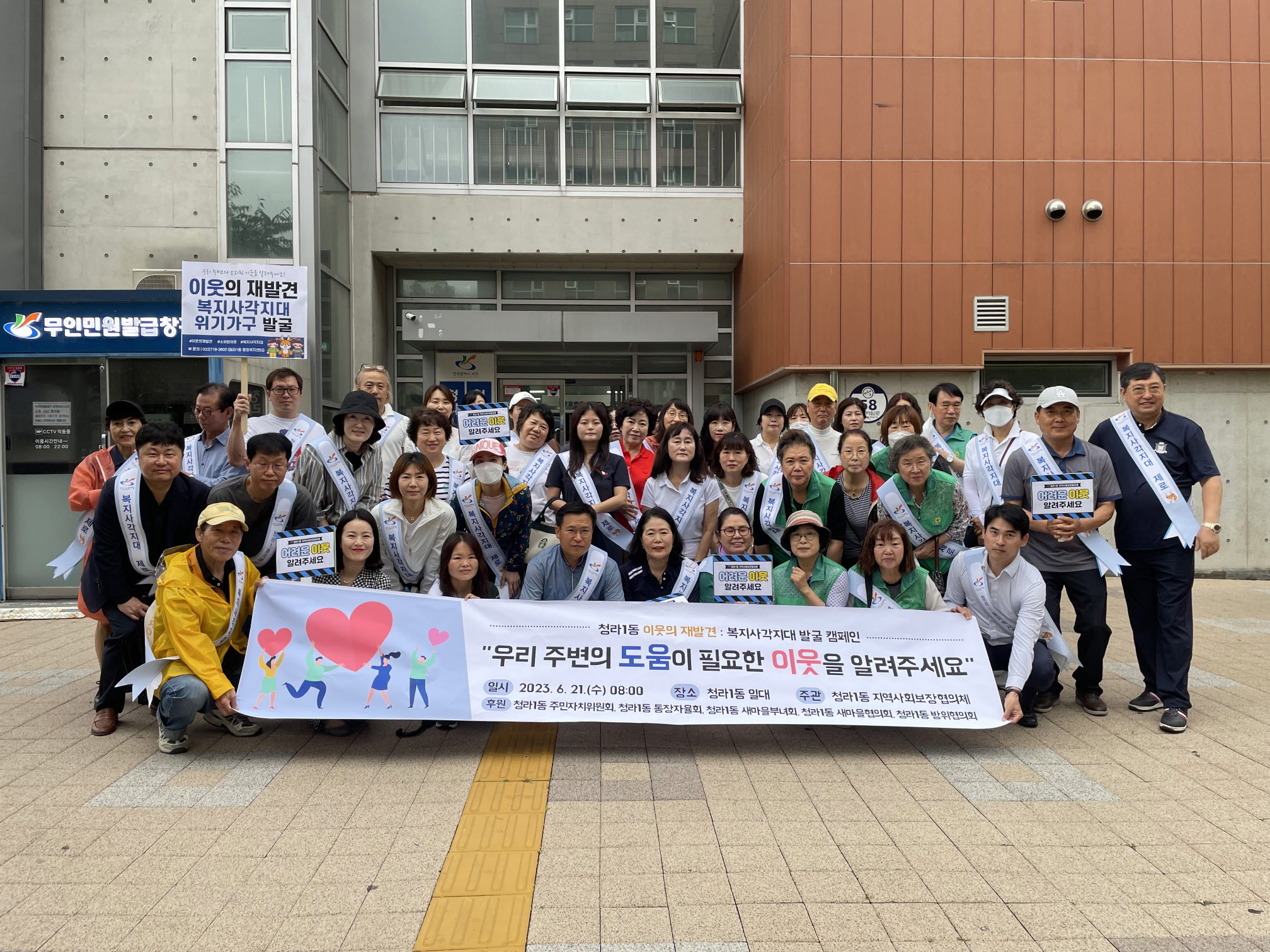 인천 서구 청라1동 지역사회보장협의체(민간위원장 조병상, 공공위원장 김남효)는 지난 21일 주민자치회, 통우회, 새마을회 등 관내 유관 단체와 함께 청라1동 일대에서 복지사각지대 발굴을 위한 ‘이웃의 재발견’ 캠페인을 실시했다.