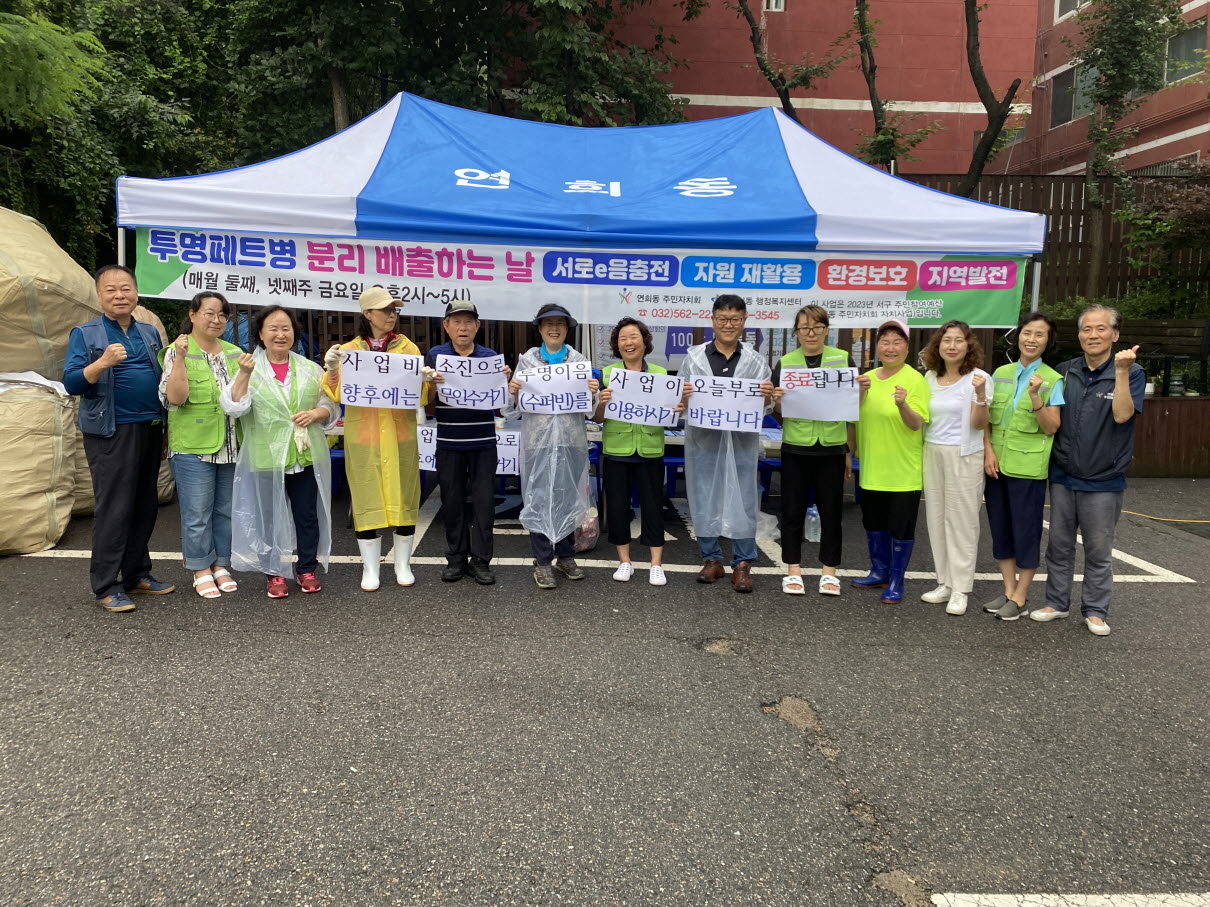 인천 서구 연희동 주민자치회(회장 조은상, 동장 이순옥)는 지난 14일을 끝으로 ‘투명페트병 분리배출, 투명e음’ 사업을 마무리했다고 밝혔다.