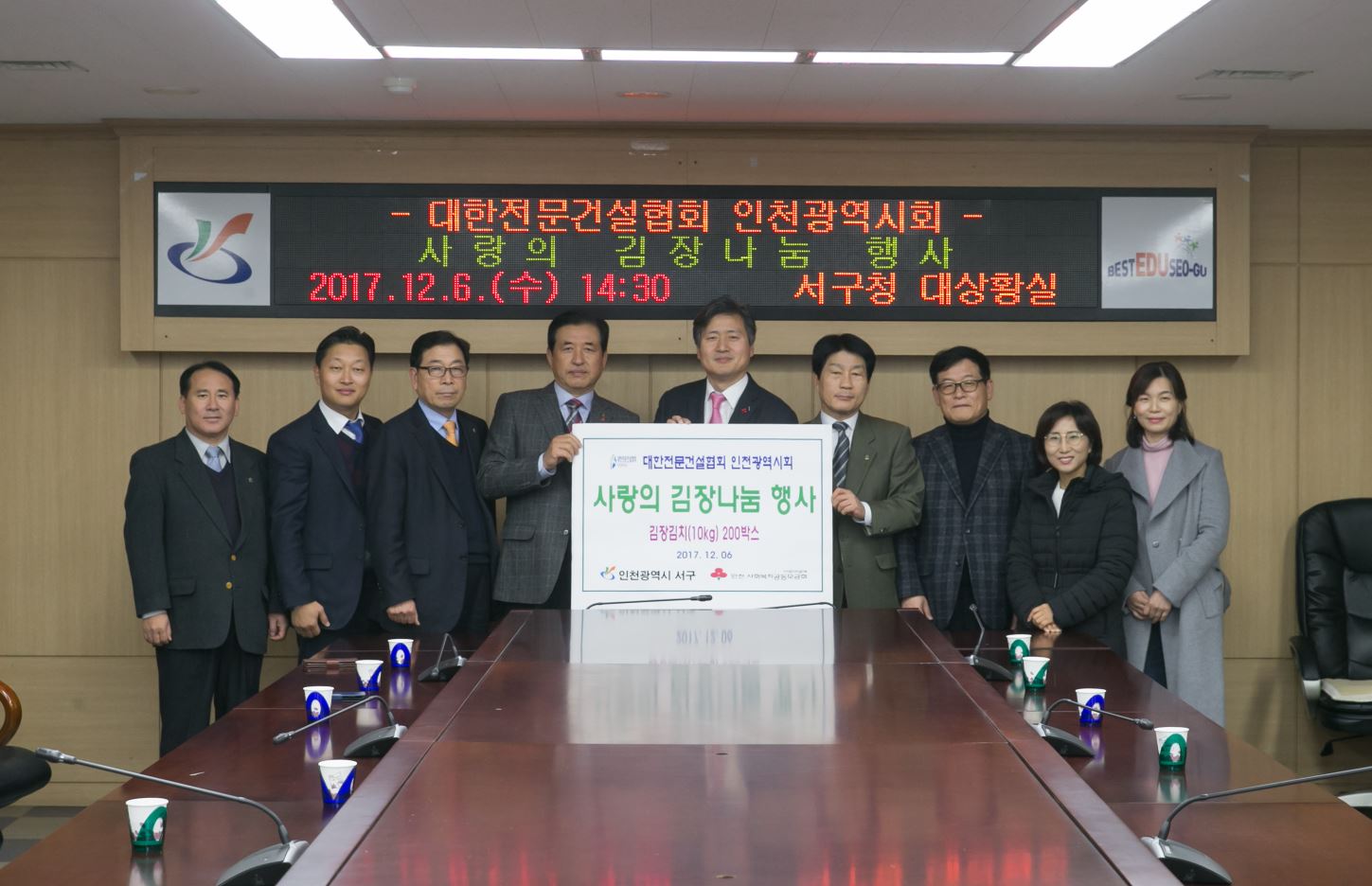 대한건설협회 인천광역시회(회장 정하음)는 지난 6일 개최한 이웃사랑 김장나눔 행사를 가지고 주변의 어려운 이웃들에게 전해달라며 이날 담근 김장김치(10kg 200박스)를 구에 전달했다.