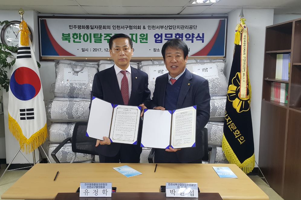 민주평화통일자문회의 인천서구협의회(회장 유정학)와 인천서부산업단지관리공단(이사장 박윤섭)은 지난 19일 민주평통 사무실에서 관내 북한이탈주민과 어려운 이웃 지원을 위한 업무협약식 및 겨울이불 지원식을 가졌다.