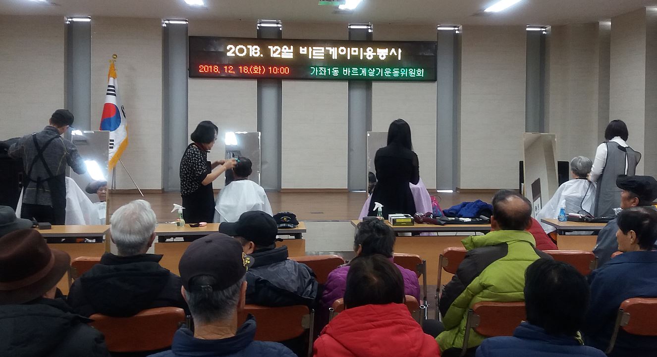 지난 2000년부터 시작된 바르게살기운동위원회 이·미용 봉사는 올해로 18년째 지속되고 있으며, 가좌1동 행정복지센터에서는 매월 셋째 주 화요일에 관내 어르신들에게 서비스를 제공하고 있다.