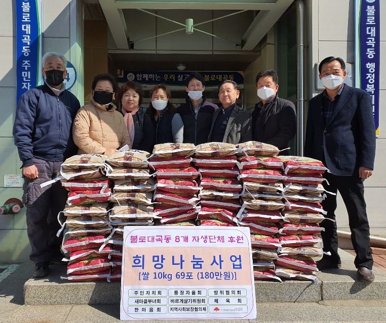 불로대곡동 지역사회보장협의체와 주민자치회, 통장자율회를 비롯한 7개 자생단체는 코로나19 확산으로 어려움을 겪는 이웃과 어려움을 함께 극복할 수 있는 희망을 나누고자 지난 11일 양곡 69포(10kg)를 불로대곡동 행정복지센터에 전달했다.