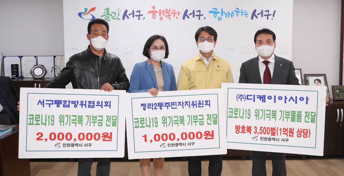 인천 서구(구청장 이재현)는 지난 19디케이아시아와 서구통합방위협의회, 청라2동 주민자치위원회가 잇따라 서구에 기부 물품과 기부금을 전달했다고 24일 밝혔다.