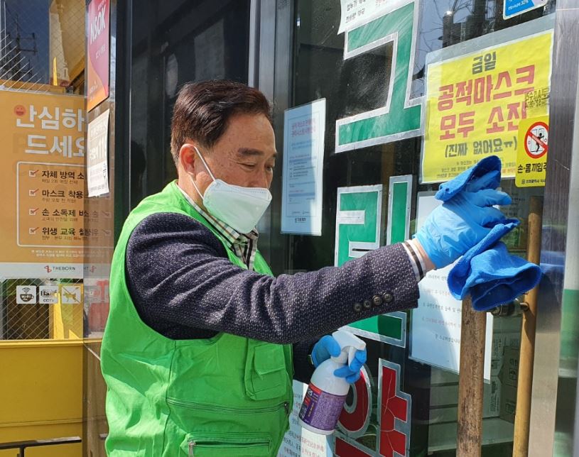이번 방역 봉사에는 민주평통 서구협의회 자문위원 10명과 자원봉사자 7명이 참석했으며, 참가자들은 서구청 일대의 상가 곳곳을 다니며 사람 손이 많이 가는 출입문을 중심으로 직접 닦아가며 소독을 진행했다.