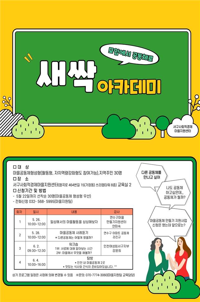인천 서구사회적경제마을지원센터는 2020년 형성형 마을공동체와 지역주민을 대상으로 마을공동체 이해 기본교육인 ‘새싹아카데미’를 운영할 계획이라고 밝혔다.