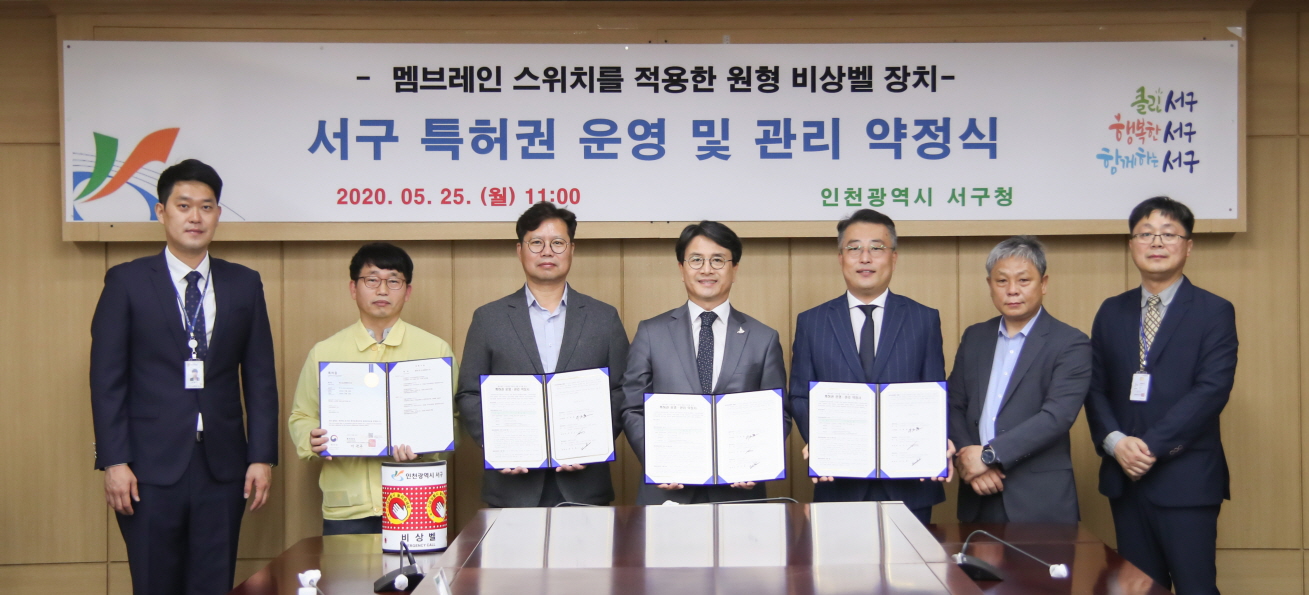 서구는 지난 25일 ‘멤브레인(Membrane) 스위치를 적용한 원형 비상벨 장치’의 공유특허권자인 ㈜이룸에스엔에스, ㈜나라이엔씨와 ‘특허권 운영 및 관리를 위한 약정’을 체결했다.