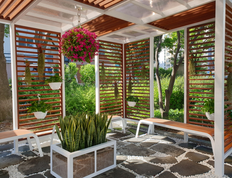 벽면에는 미세먼지 제거에 탁월한 공중식물인 수염틸란드시아(Spanish moss)를 행잉 형태로 조성해 ‘에코 쉼터’를 이용하는 민원인에게 건강하고 쾌적한 환경을 제공하고자 했다.