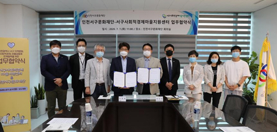 인천서구문화재단은 지난 7일 문화재단 회의실에서 서구사회적경제마을지원센터와 지역문화진흥 업무협약(MOU)을 체결했다. 업무협약식은 인천서구문화재단과 서구사회적경제마을지원센터 관계자가 참석한 가운데 진행됐다.