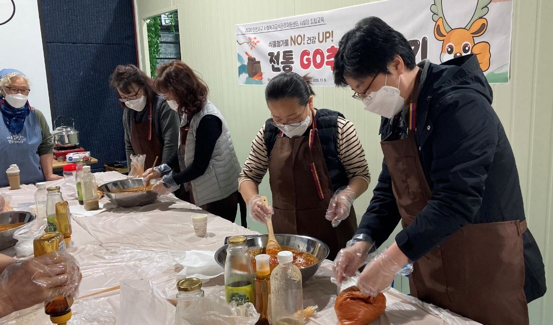 이번 집합 교육은 코로나19 확산에 따른 사회적 거리 두기 등 방역수칙을 지키면서 소규모 인원으로 이뤄졌으며, 전통방식 고추장 만들기에 대한 이론과 실습, 식품첨가물에 대한 식품안전 교육을 병행함으로써 노인복지시설 어르신의 급식 수준 향상을 도모하고자 진행됐다.