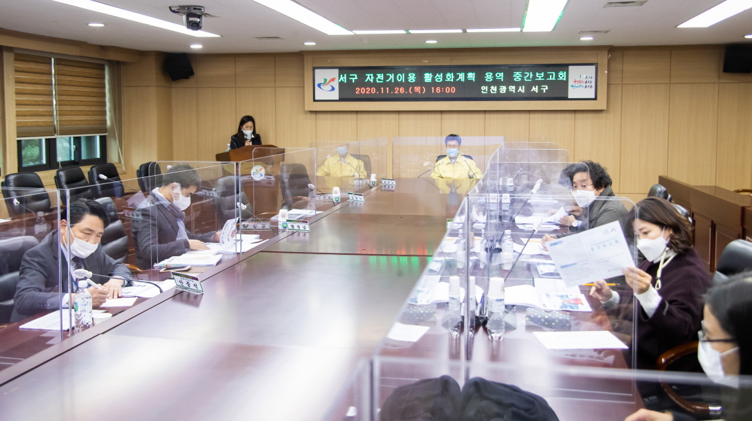 서구는 지난 26일 최종윤 부구청장 주재로 인천광역시자전거이용활성화위원회, 서구자전거동호회, 용역 수행기관인 주식회사 이원이엔씨 등 관계자가 참석한 가운데 ‘서구 자전거 이용 활성화 계획수립’ 용역 중간보고회를 열었다.