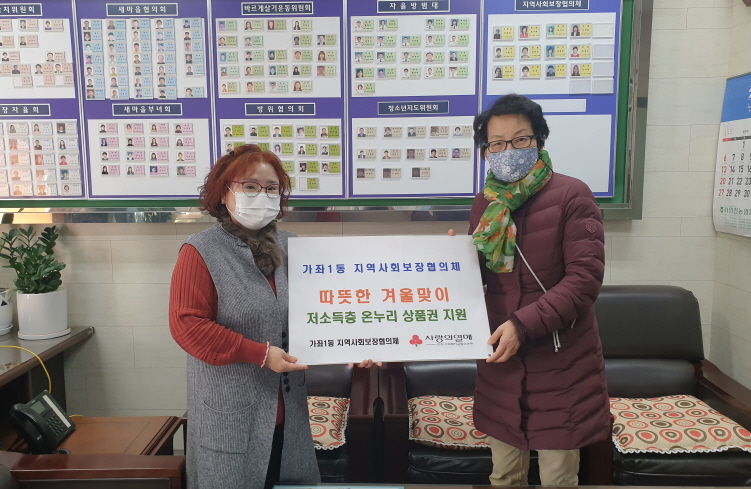 인천 서구 가좌1동 지역사회보장협의체(공동위원장 이효순, 김벌순)는 ‘따뜻한 겨울맞이’ 지원을 위해 온누리 상품권 300만 원 상당을 관내 저소득 가정에 전달한다고 16일 밝혔다.