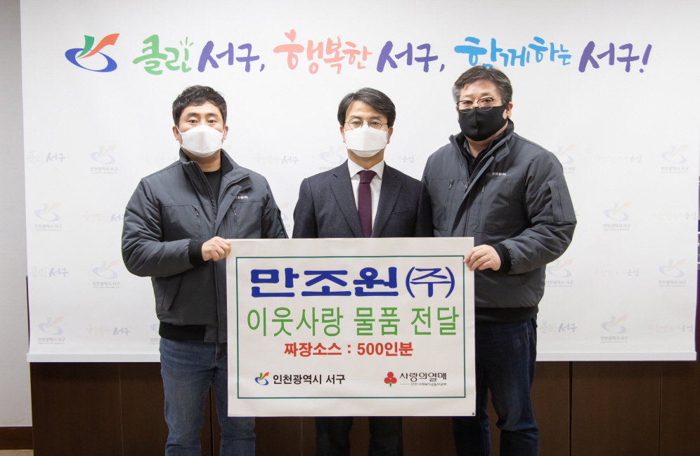 만조원(주)(대표 박정욱)은 인천 서구(구청장 이재현)에 지난 22일 이웃돕기 사랑의 짜장소스 500인분을 전달했다. 이번에 기부된 짜장소스는 인천사회복지공동모금회에 기탁 처리되어 관내 푸드뱅크, 관내 활동 봉사단체를 통해 저소득 가정 및 시설에 전달된다.