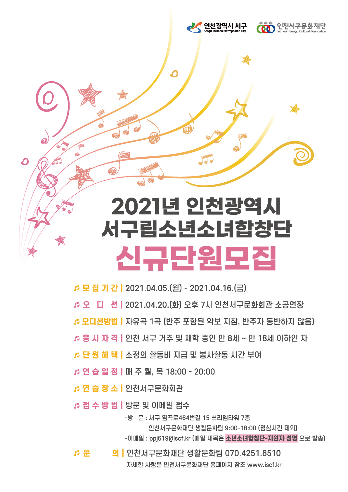 ❍ 접수기간 - 서구립합창단 : 2021. 3. 29.(월) ~ 4. 11.(일) - 서구립소년소녀합창단 : 2021. 4. 5.(월) ~ 4. 16.(금) ❍ 접수방법 - 재단 홈페이지에서 응시원서 다운로드 후, 작성하여 제출 - 방문 접수 : 인천서구문화재단 (생활문화팀) (평일 09:00 ~ 18:00, 점심시간 제외) - 이메일 접수 : ppj619@iscf.kr ․ 신청시 메일제목 : 서구립예술단 지원(예술단명/지원자 성명) ❍ 응시서류 - 서구립합창단 : 응시원서 1부, 오디션용 악보 1부(반주포함 된 악보로 제출) - 서구립소년소녀합창단 : 응시원서 1부, 오디션용 악보 1부(반주 포함된 악보로 제출) ❍ 문의 : 070-4251-6510 |