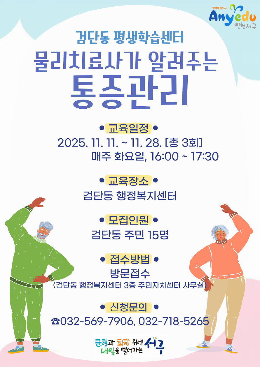 검단동 평생학습센터 <물리치료사가 알려주는 통증관리> 수강생을 모집합니다.