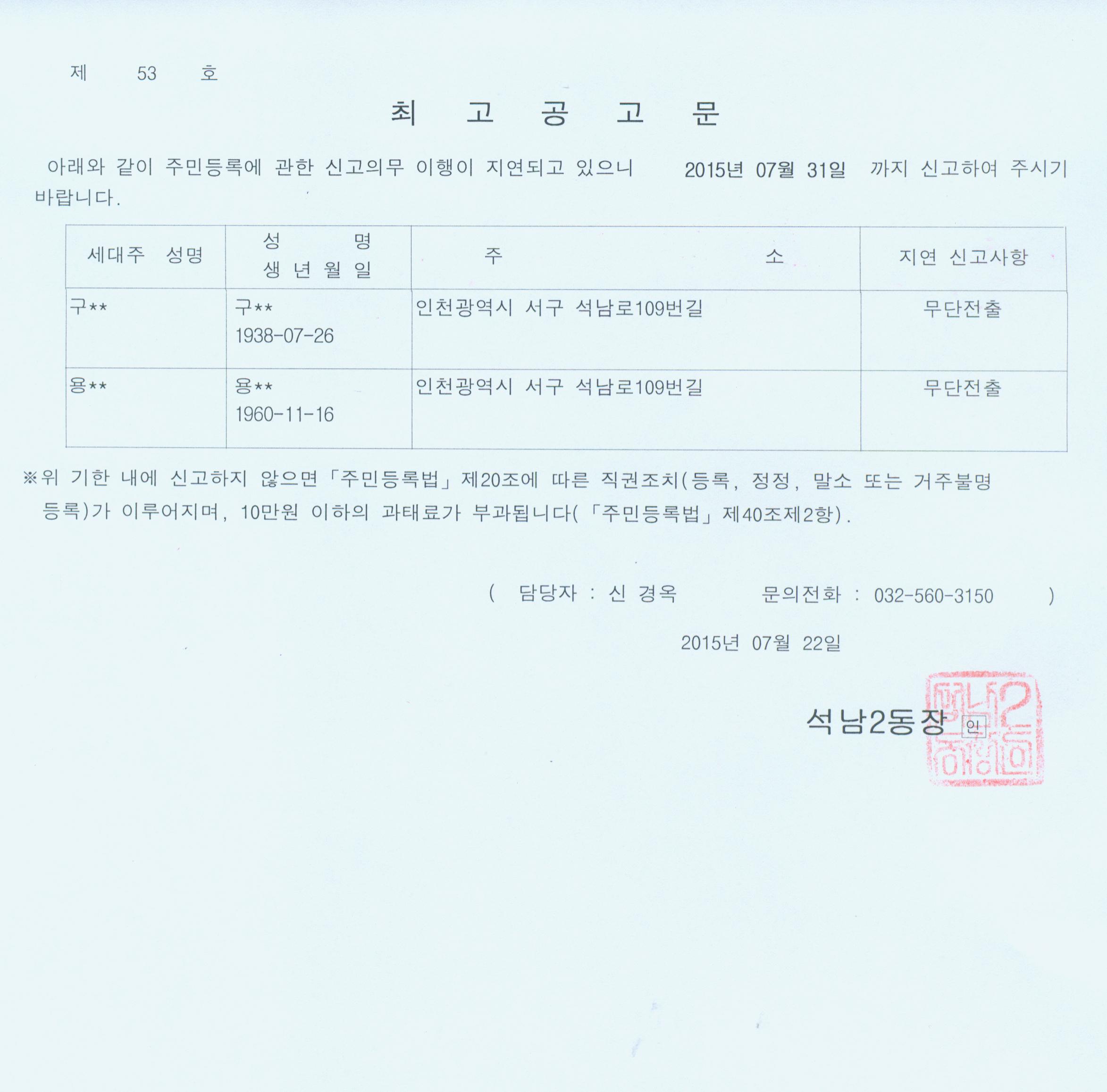 주민등록 무단전출자에 대해 주민등록법 제20조 및 동법 시행령 제28조 규정에 의거 아래의 고시공고를 홈페이지 및 게시판에 게재하고자 합니다.