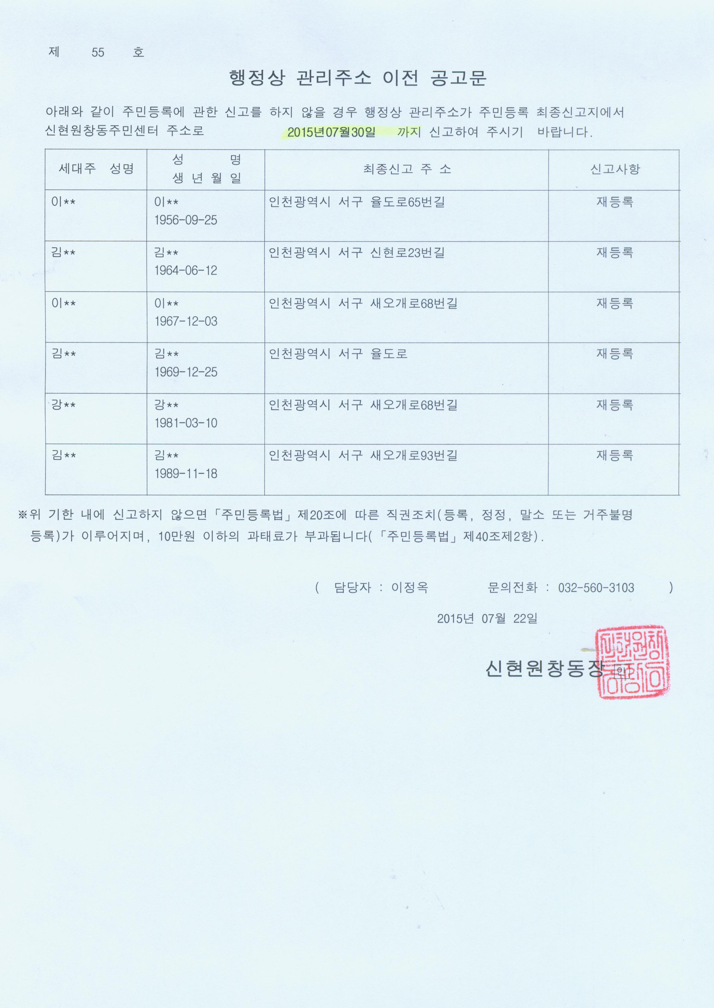 주민등록법 제20조제6항 및 부칙 제2조에 의거, 거주불명등록 후 1년이 경과한 거주불명등록자에 대하여 행정상 관리주소를 신현원창동 주민센터로 이전하기 위한 1차 공고를 실시하고자 합니다. |