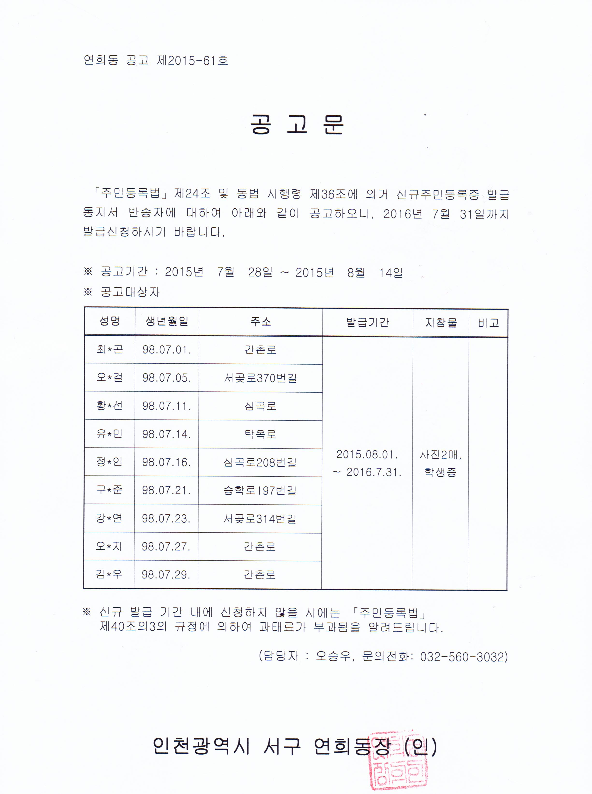 2015년 7월 만 17세가 된 1998년 7월생 신규주민등록증 발급대상자에 대하여 주민등록법 제24조 및 동법 시행령 제36조의 규정에 의거 2015년 7월 2일 발급신청 안내 통지서를 통지하였으나, 수취인 부재 등으로 발급통지서가 반송된 대상자에 대하여 아래와 같이 공고하고자 합니다.