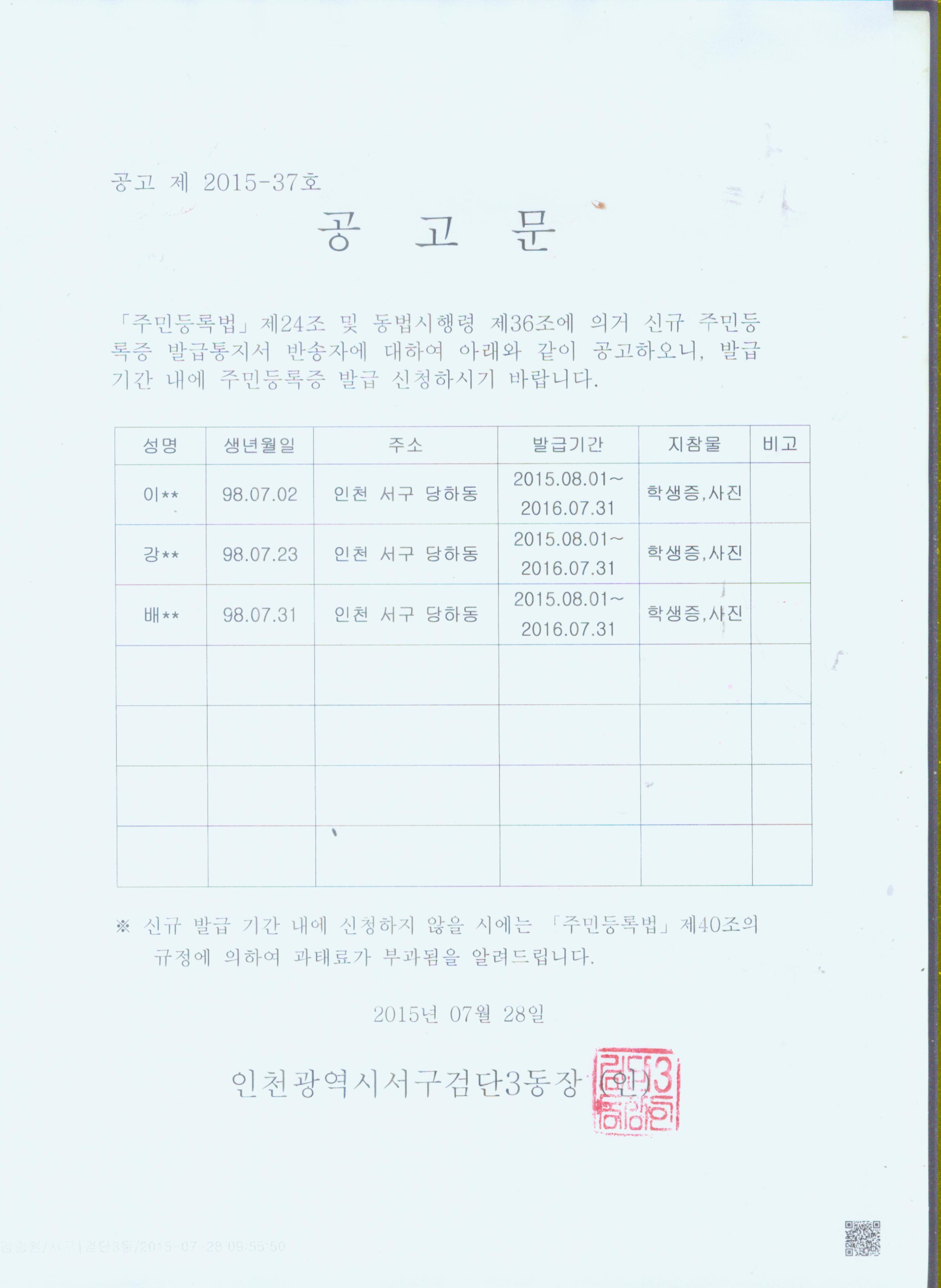 주민등록법 제24조 및 동법 시행령 제36조의 규정에 의거 2015년 7월 2일 발급신청