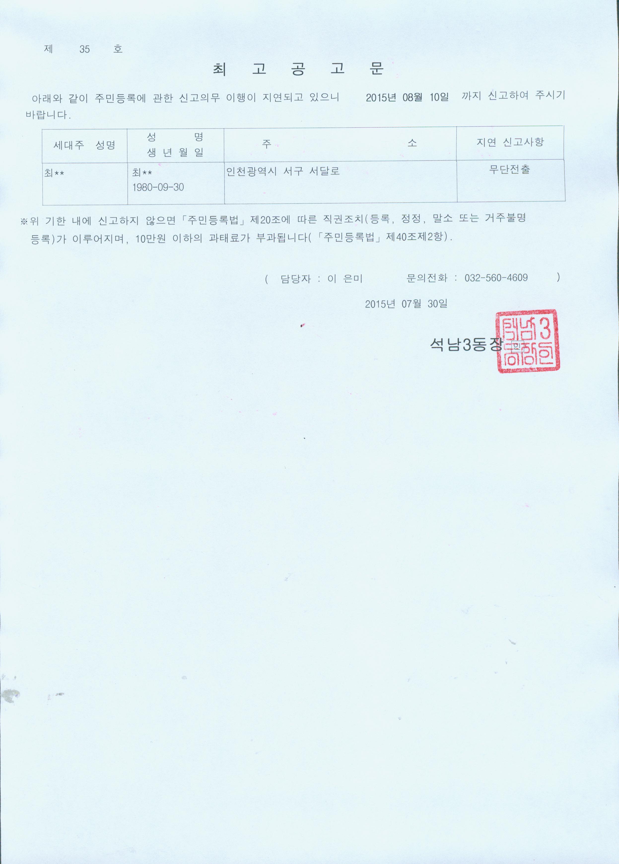 주민등록 무단전출로 판단되는 자에 대하여 최고장을 발송하였으나 기한 내에 신고하지 않아 주민등록법 제20조 및 제3항, 동법 시행령 제28조에 의거하여 아래와 같이 공고(최고공고)합니다.