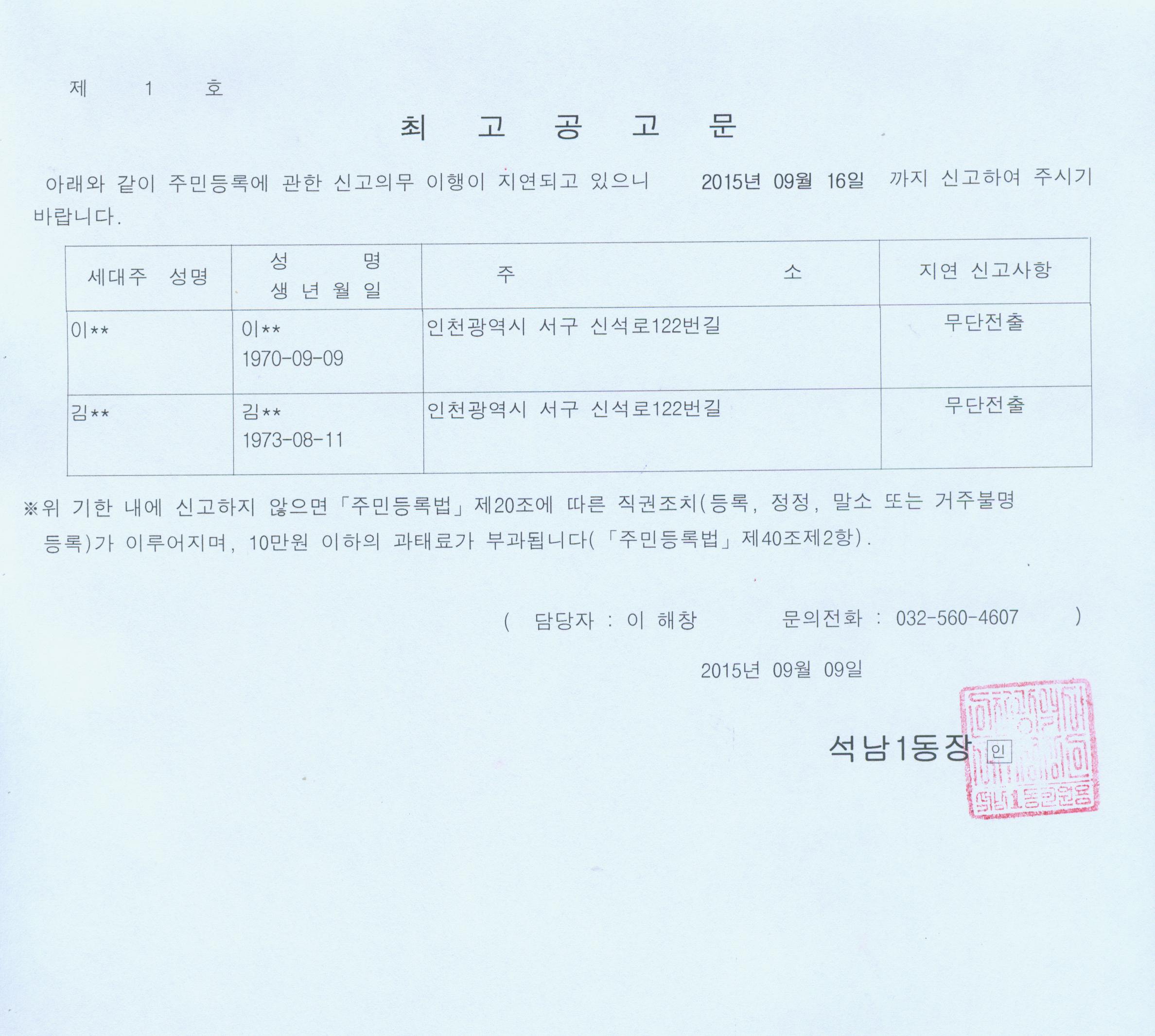 ○ 공고내용 : 무단전출자에 대한 최고공고 (공고기간내 주소이전신고)